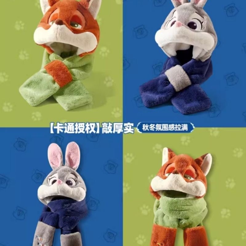 狐狸尼克毛绒帽子围巾一体女冬季加厚卡通可爱保暖防寒手套三件套