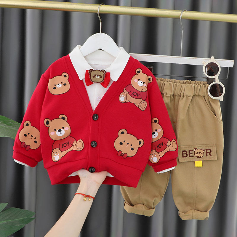 男宝宝新年喜庆套装红色卫衣加绒儿童拜年服冬季休闲男童加厚衣服
