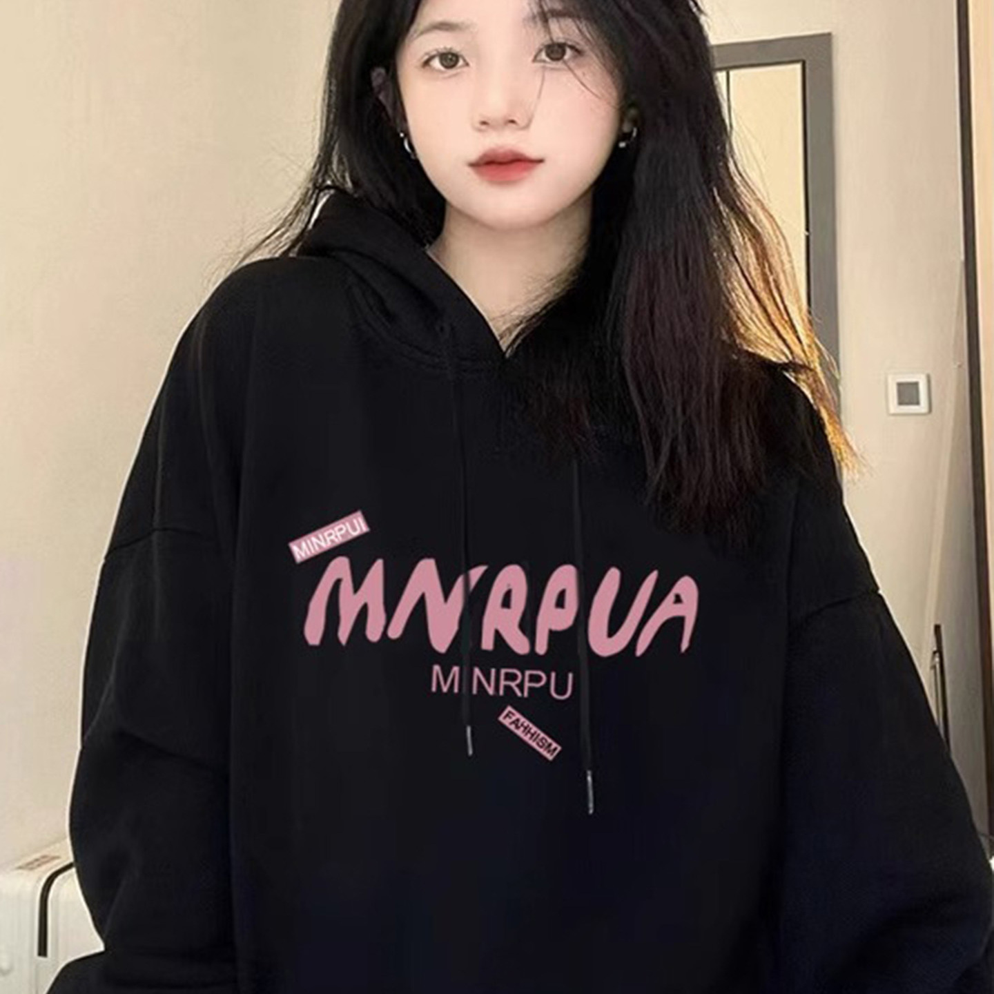 黑色字母抽绳连帽卫衣女2025新款宽松慵懒风带帽加绒加厚外套韩系