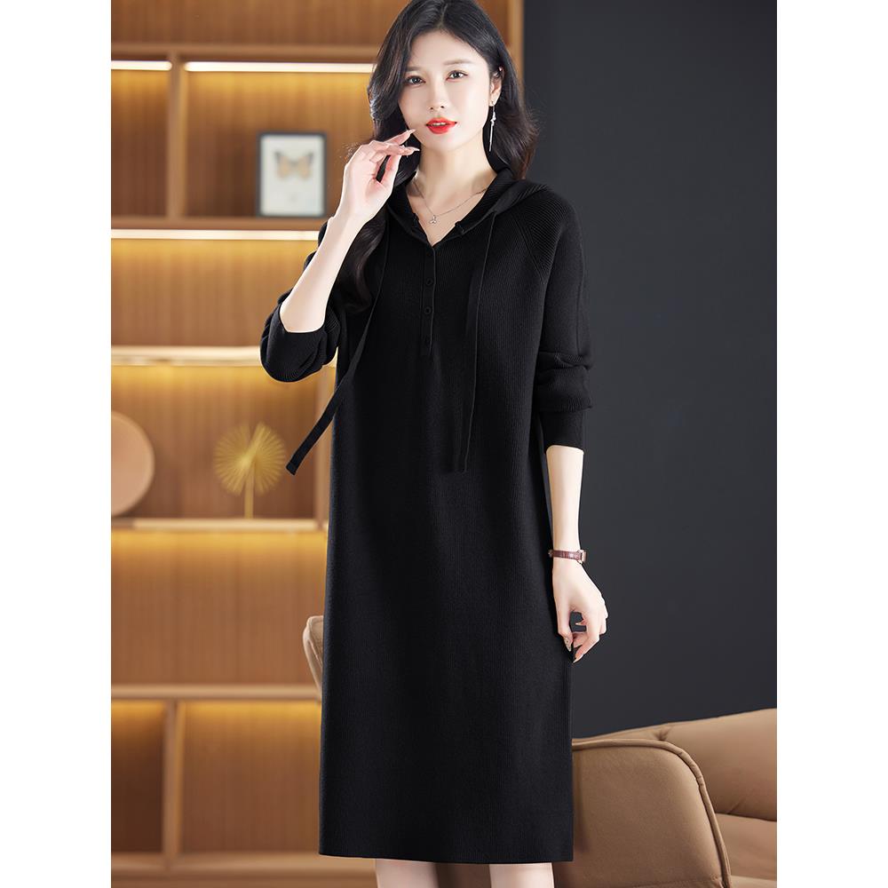 黑色带帽连衣裙秋冬长款毛衣裙大码遮肉显瘦针织卫衣裙2025年新款