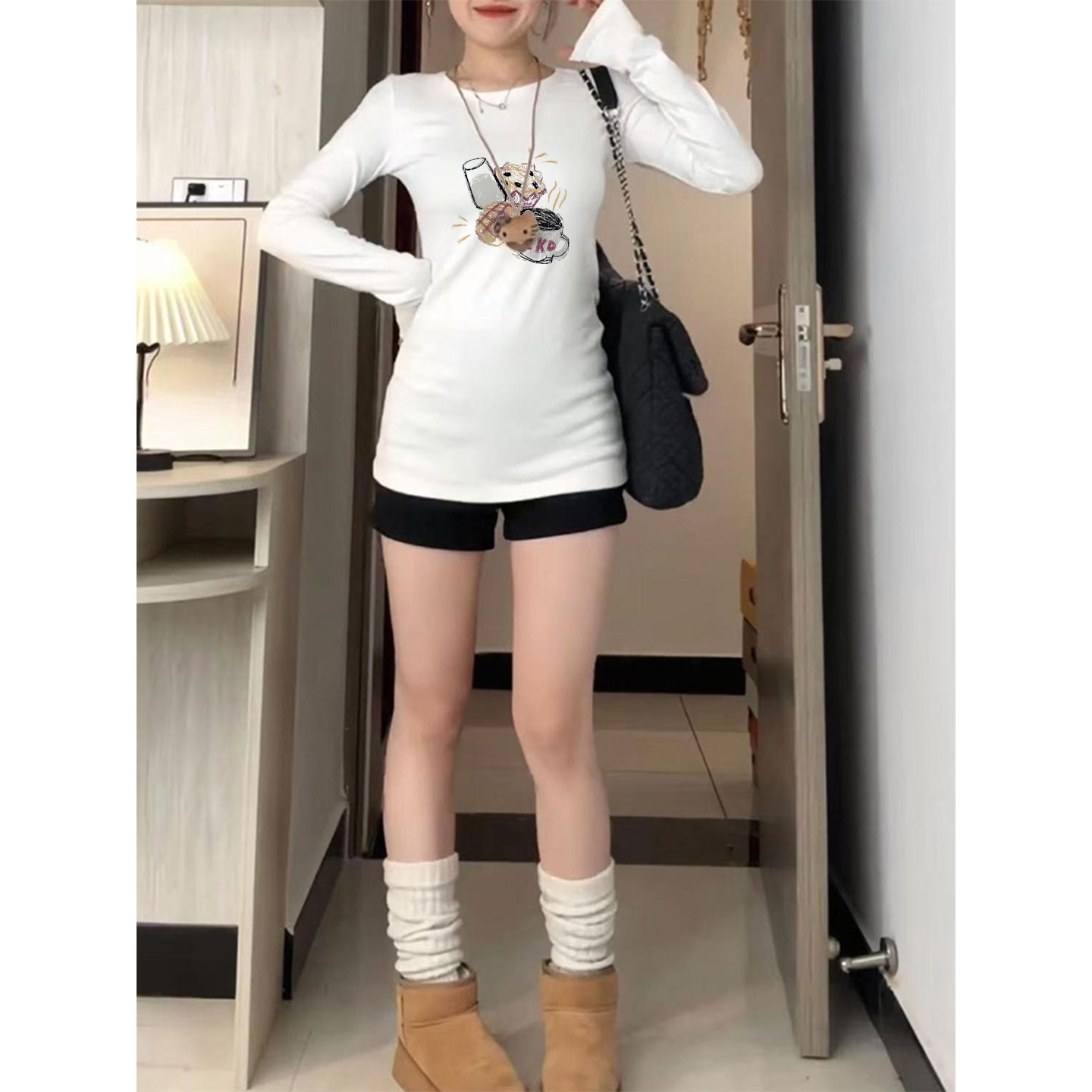 2025新款中长款长袖t恤女装秋冬加绒内搭打底衫搭配鲨鱼裤的上衣