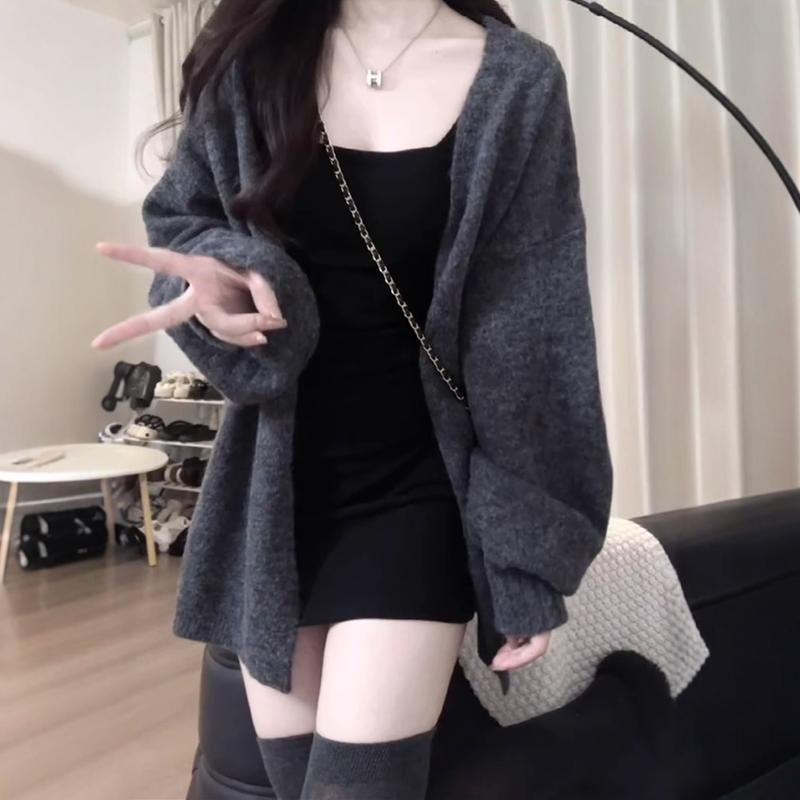 韩版慵懒风中长版灰色长袖针织开 衫女2024秋宽松显瘦辣妹毛衣外