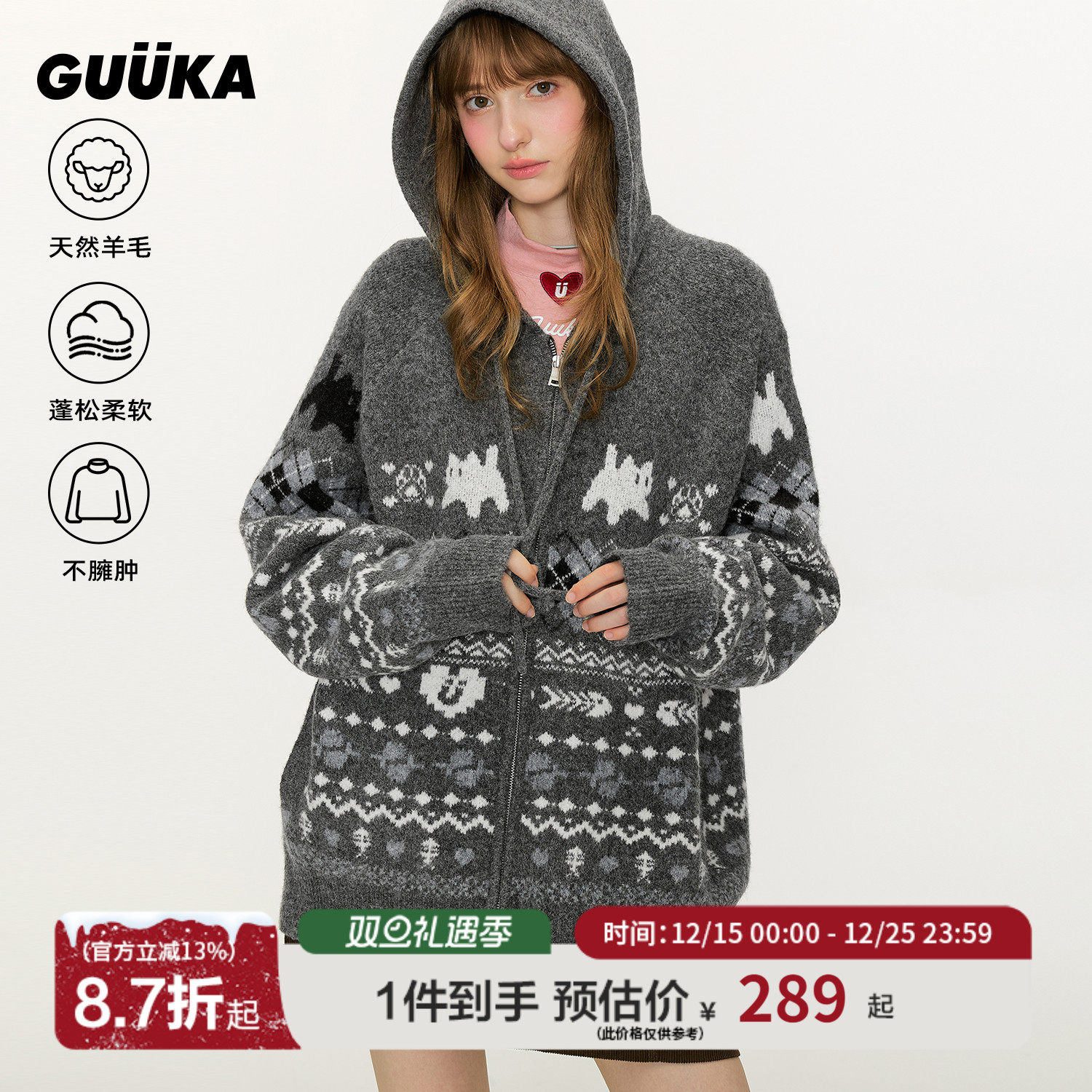GUUKA潮牌费尔岛毛衫女款连帽针织衫 猫咪提花毛衣绵羊毛开衫外套