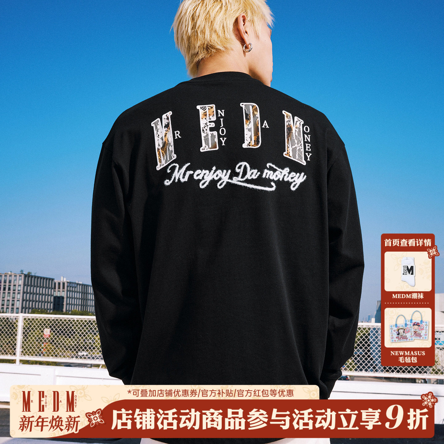 MEDM黑白纯色火烧蕾丝圆领宽松长袖T恤新品潮牌百搭情侣休闲上衣