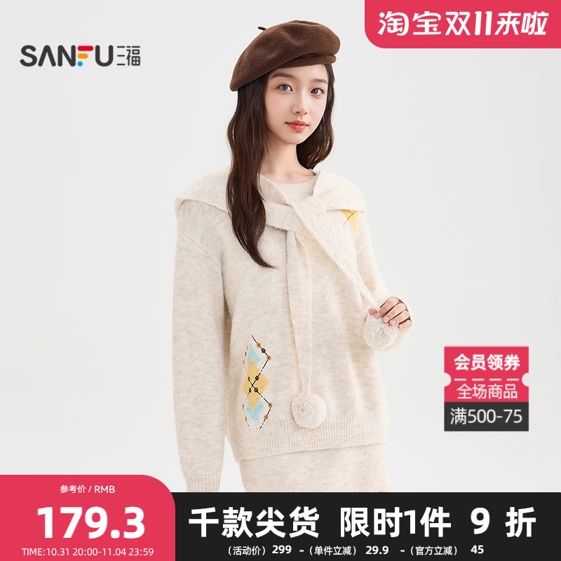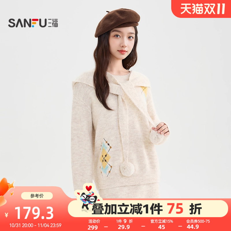 三福套装2025冬季撞色刺绣毛球连帽毛衣短裙两件套女装511154