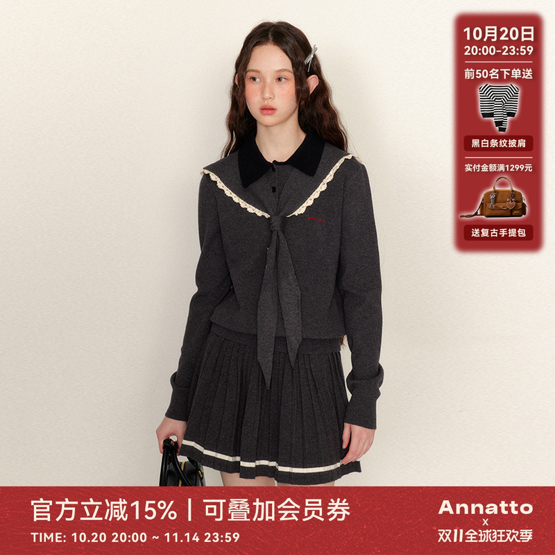 ANNATTO航海日记 针织套装女时尚两件套可拆卸海军领毛衣百褶短裙