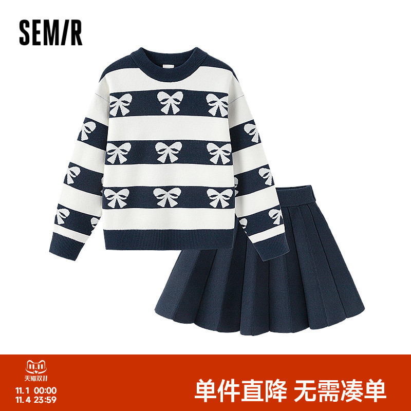 森马儿童毛衣套装2024新款短裙两件套蝴蝶结提花冬装甜美女童装潮