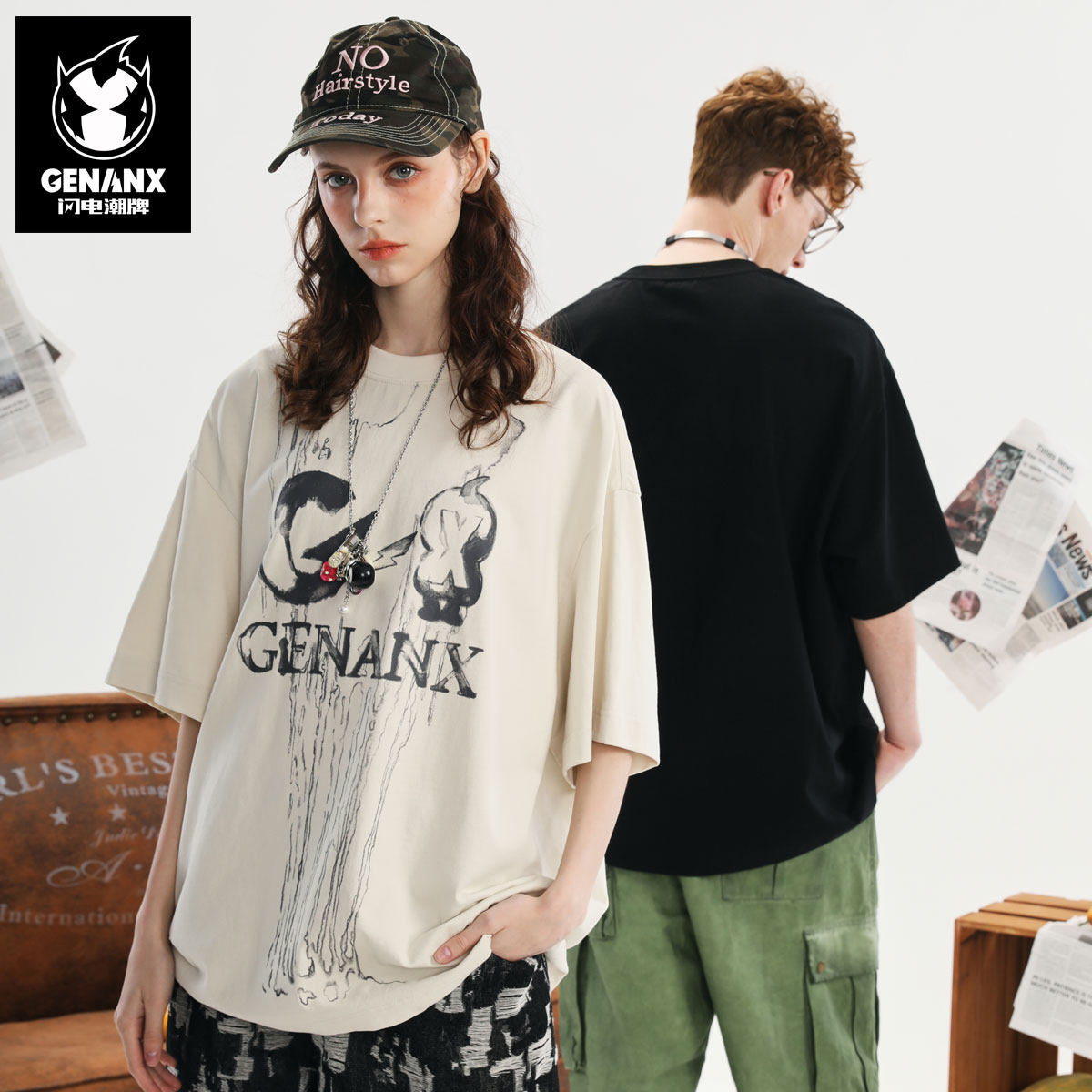 GENANX闪电潮牌2025夏季新款情侣装T恤潮流高级水墨风流行上衣男