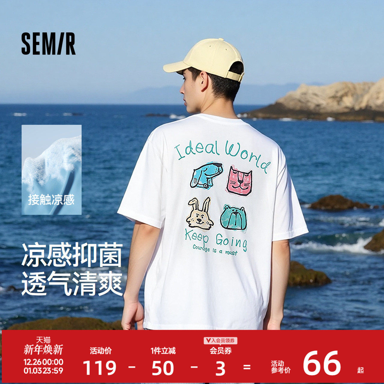 森马短袖T恤男小众小狗宠物卡通印花情侣装25夏新款凉感抗菌 上衣