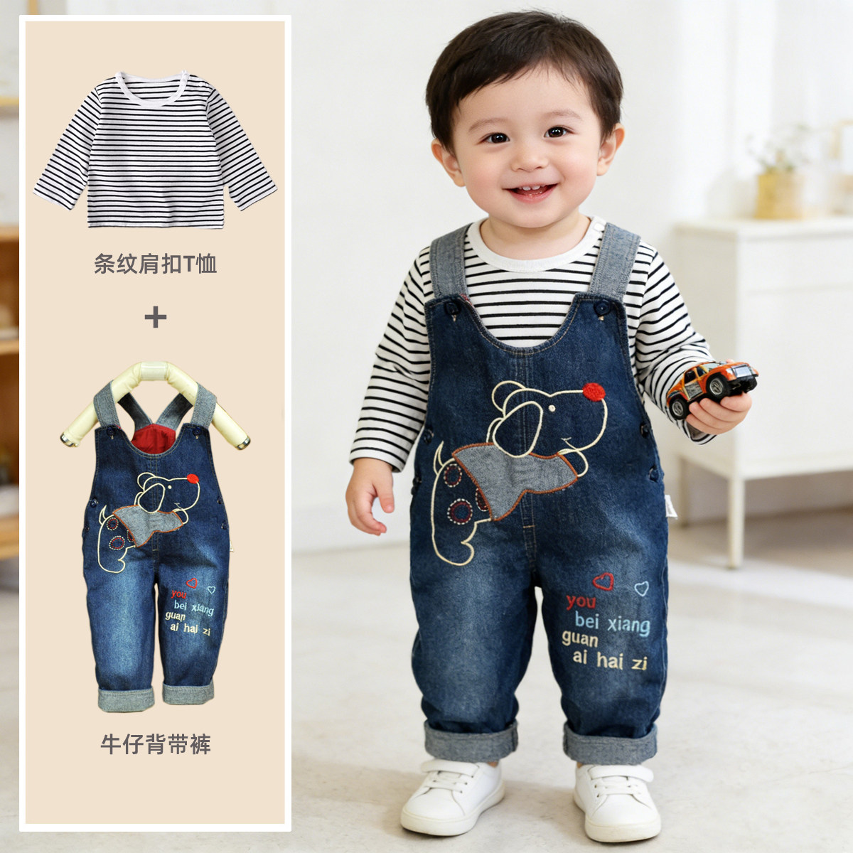 趴趴狗男宝宝牛仔裤打底衫儿童背带裤套装卡通潮款两用裆春秋单层