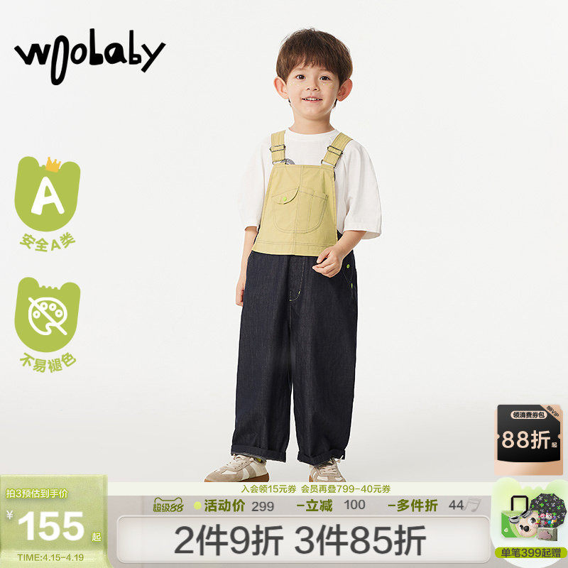 woobaby儿童牛仔背带裤男女童夏新款小童宝宝裤子直筒休闲长裤