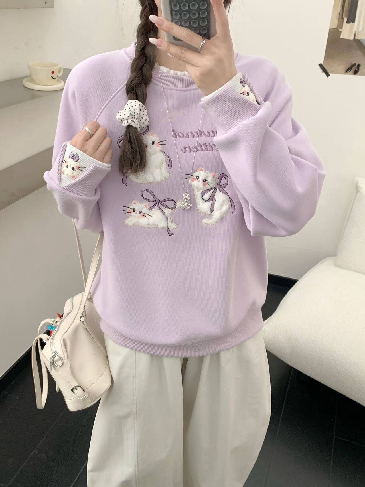 三只小猫重工刺绣加绒加厚花边领假两件圆领长袖卫衣女套头宽松潮