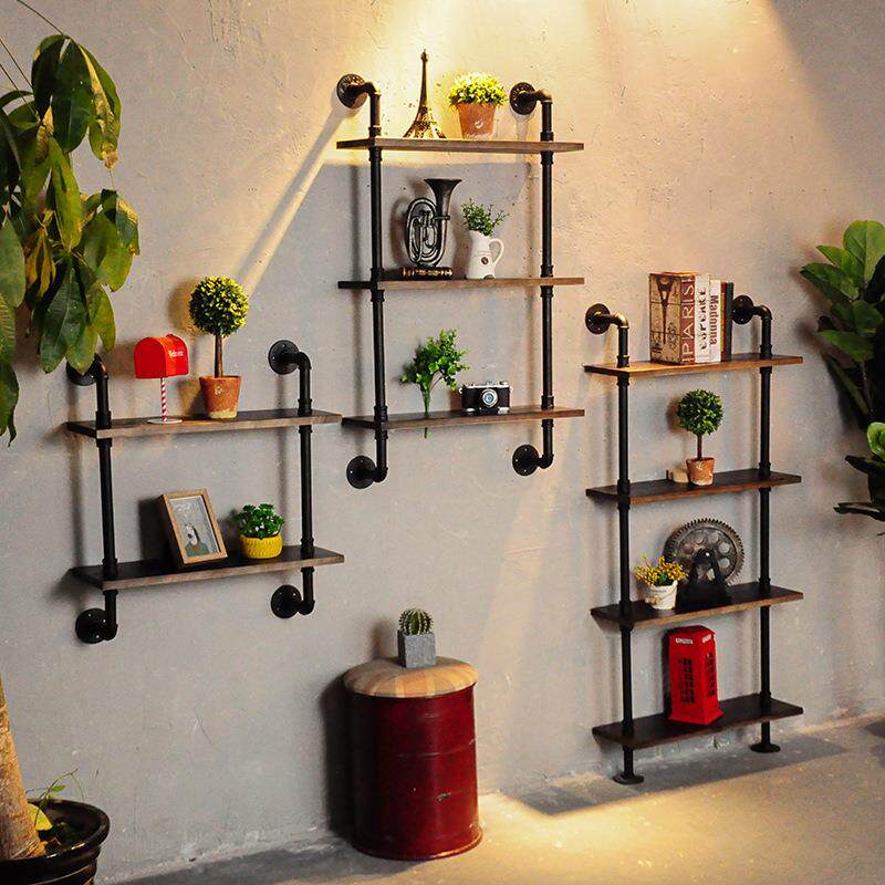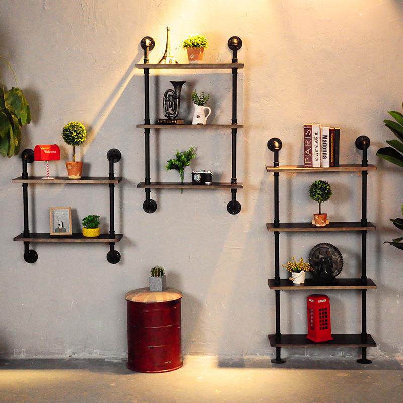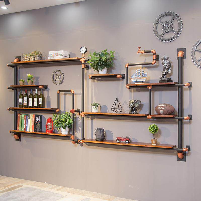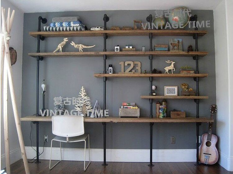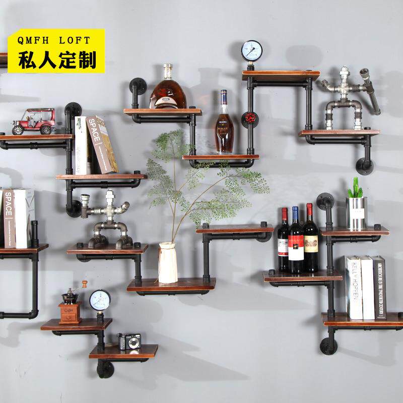 定制墙体书架落地铁艺墙上复古置物架壁挂水管装饰loft收纳架实木