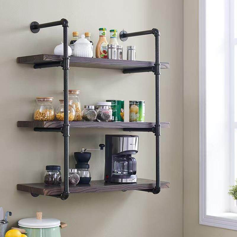 复古水管3层壁挂式书架 美式厨房储物架 铁艺搁板墙上实木置物架