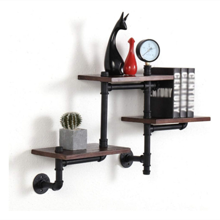 复古水管置物架墙上铁艺壁挂书架多层实木置物架工业风管道展示架