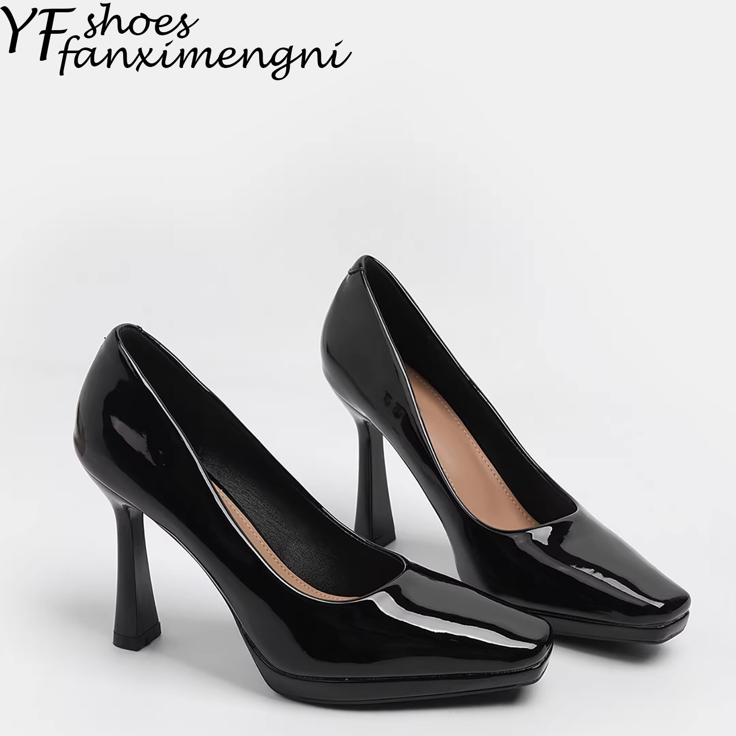 10CM高跟鞋防水台性感细跟浅口单鞋女COS圆头女鞋漆皮工作