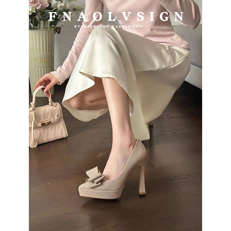 法式粗跟蝴蝶结浅口单鞋女2025新款米白色厚底防水台不累脚高跟鞋