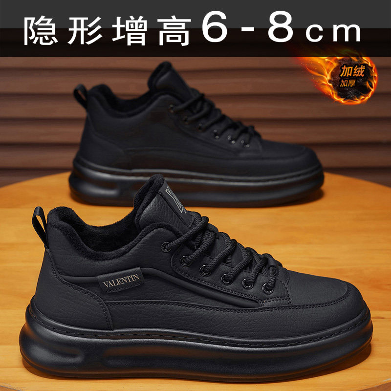 冬季男鞋防水加绒棉鞋内增高8CM中高帮板鞋全黑色鞋子厚底休闲鞋