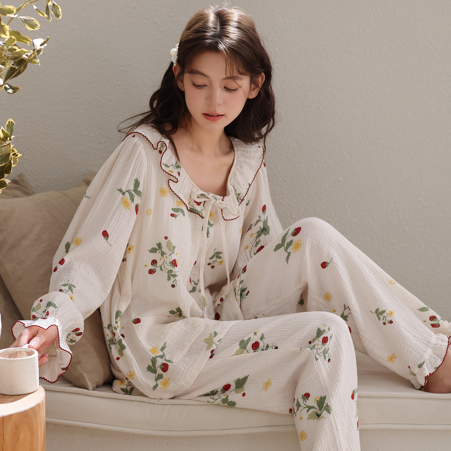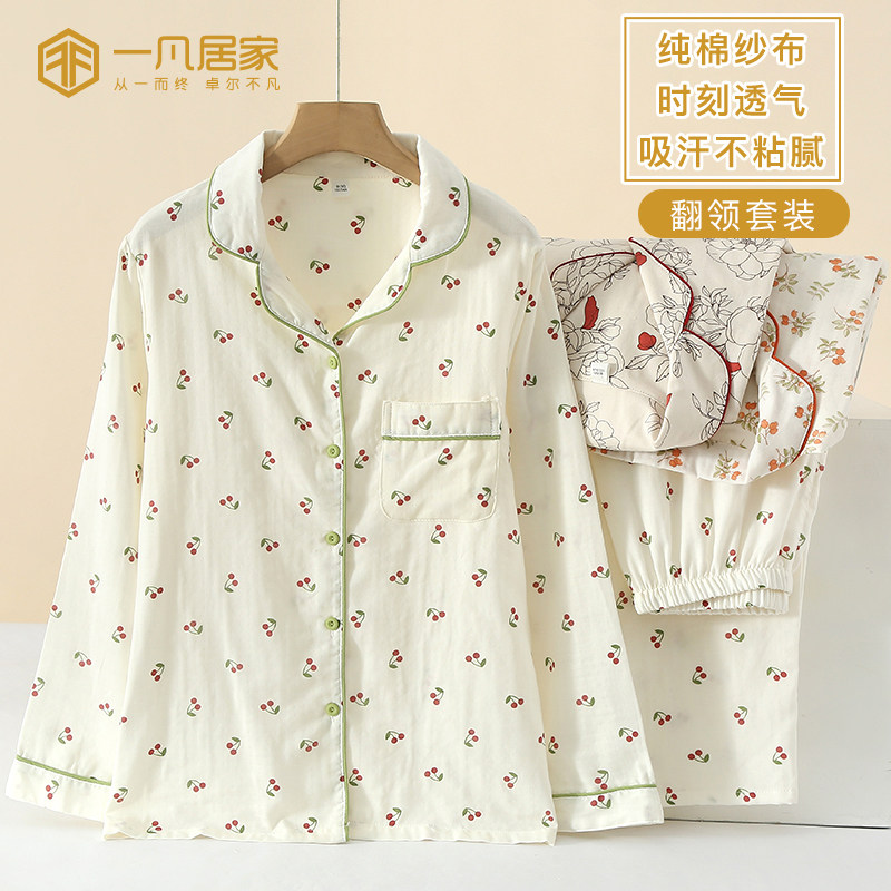 春秋女士睡衣纯棉双层纱布长袖宽松简约棉质绉布夏季家居服两件套