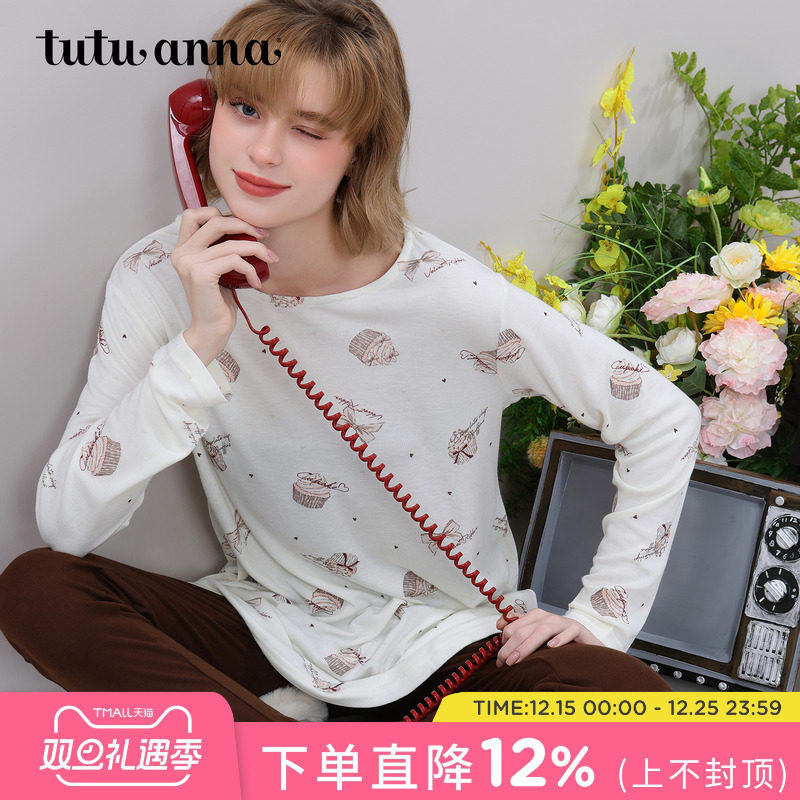 tutuanna春秋女士睡衣 蛋糕满印图案舒适圆领长袖家居服套装女