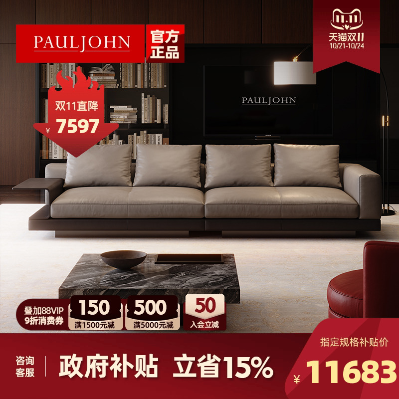 PAULJOHN现代简约直排全真皮沙发别墅平层客厅意式轻奢羽绒皮沙发