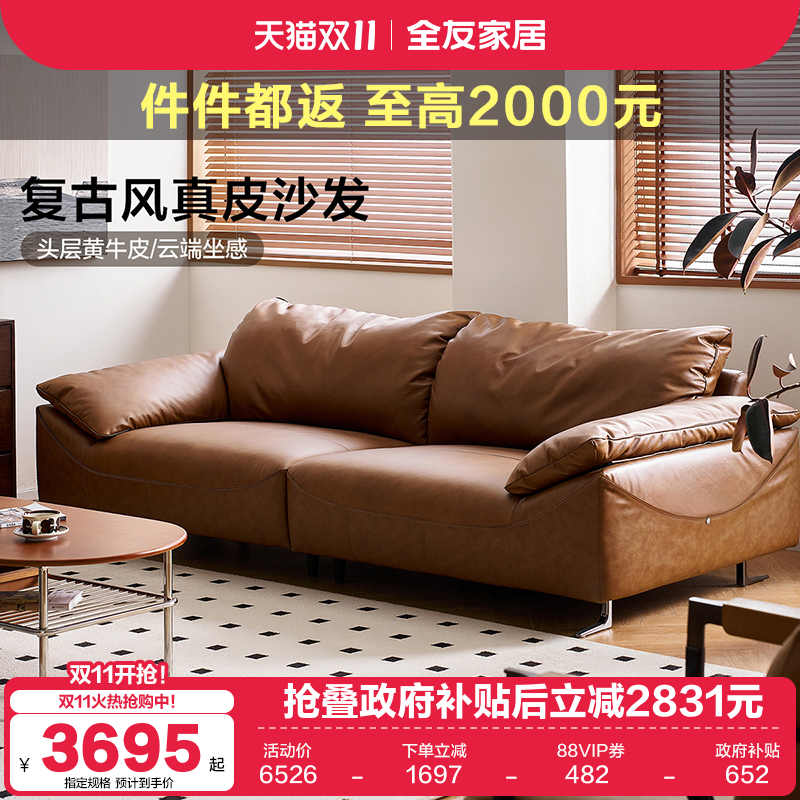 全友家居复古风头层牛皮真皮沙发客厅直排三人位羽绒沙发2025新款