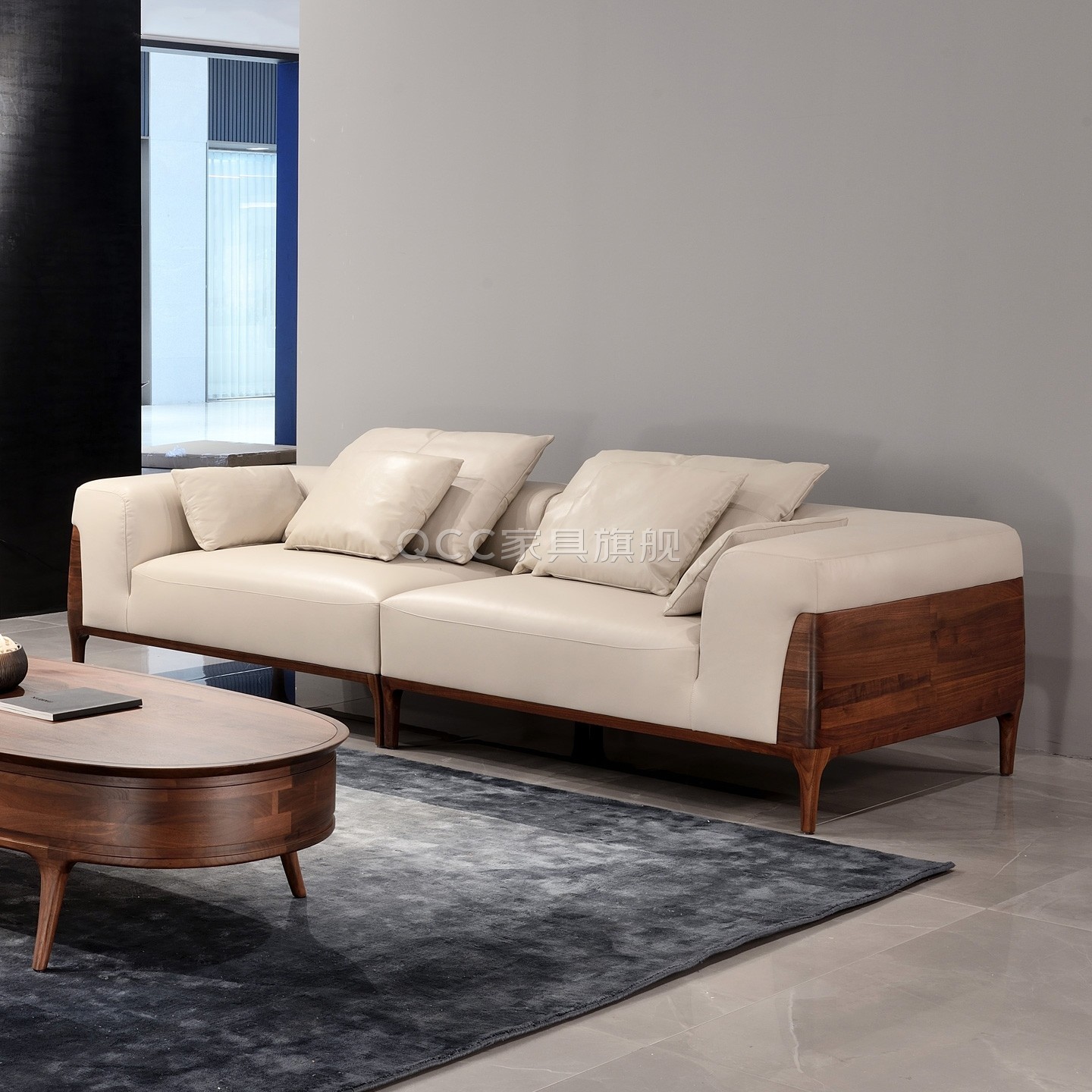 【U标·胡桃纪】全友家居黑胡桃木实木沙发客厅直排真皮羽绒沙发