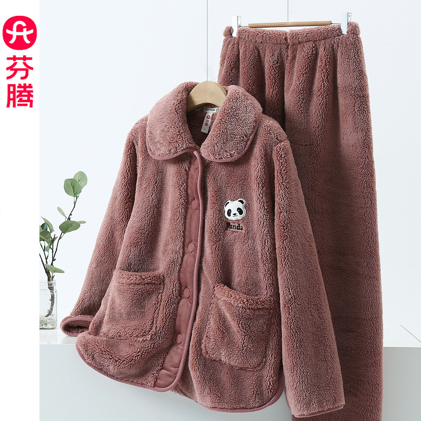芬腾珊瑚绒睡衣女秋冬季加绒加厚卡通可爱熊猫翻领外穿家居服2025