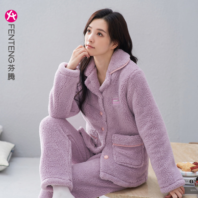 芬腾珊瑚绒睡衣女秋季加绒加厚翻领大口袋可外穿家居服套装2025年
