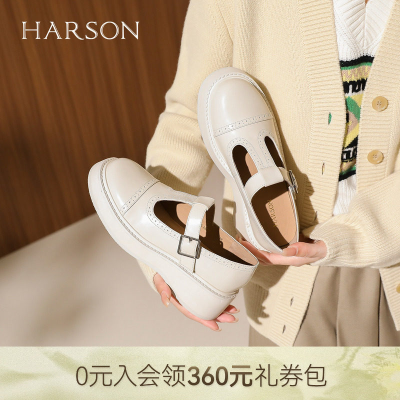 哈森春秋复古风厚底玛丽珍鞋纯色布洛克休闲女单鞋HS229206