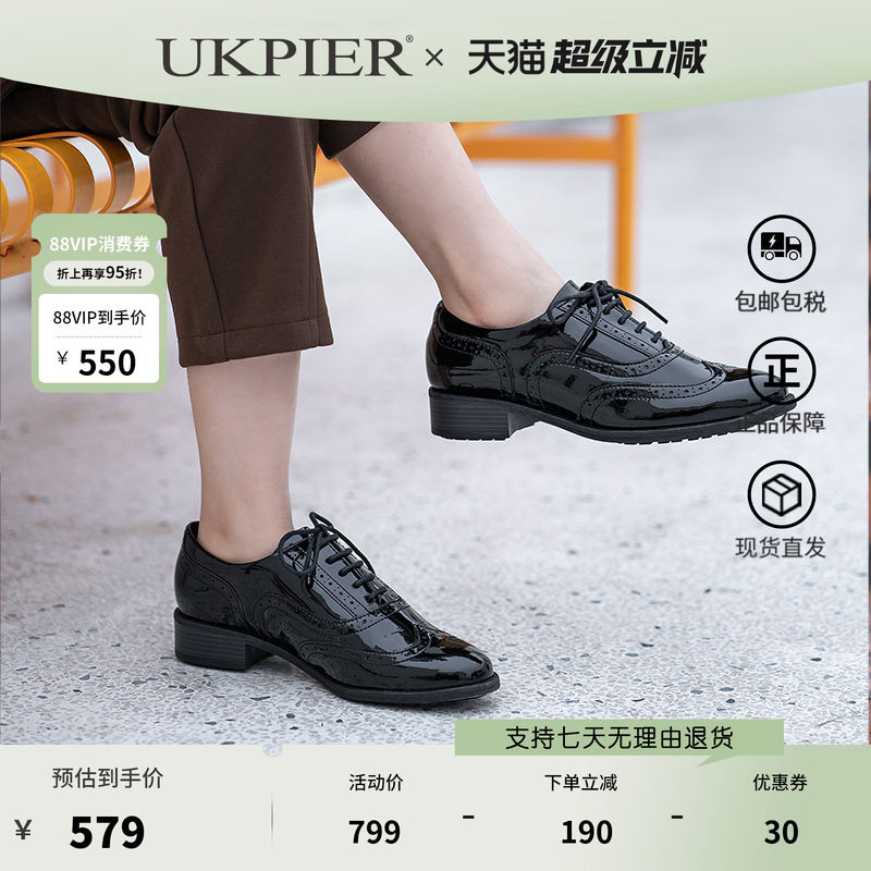 金猴女皮鞋厚底2026年春季新款中跟系带皮鞋女雕花休闲布洛克女鞋