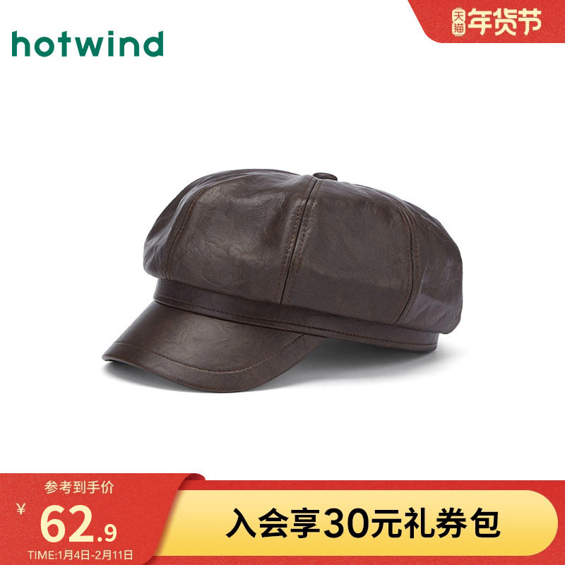 热风女士帽子文字八角帽2025年秋季新款复古时髦pu皮显脸小艺术帽
