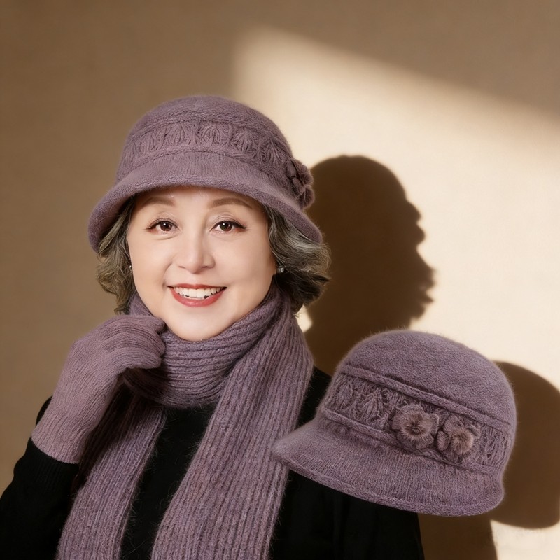 冬季中老年女士帽子围巾一体加绒妈妈兔毛帽护耳防寒老太太针织帽