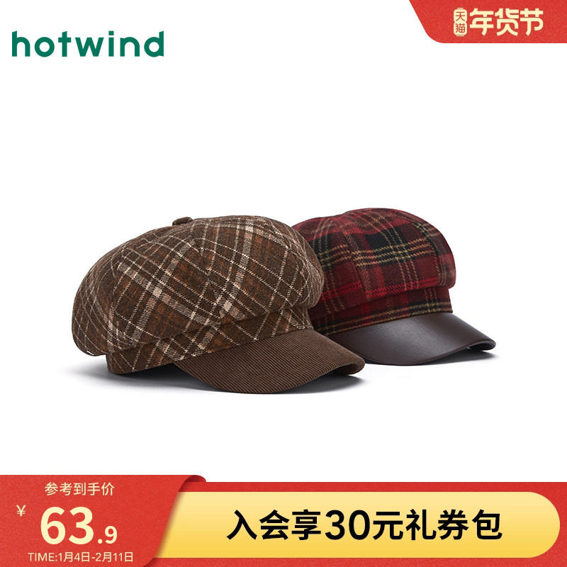 热风女士帽子格纹八角帽2025年冬季新款拼接复古显脸小八角鸭舌帽