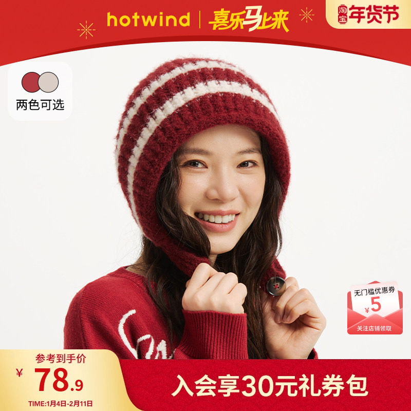 热风女士帽子2025年冬季新款红色条纹围巾帽子二合一韩系针织帽