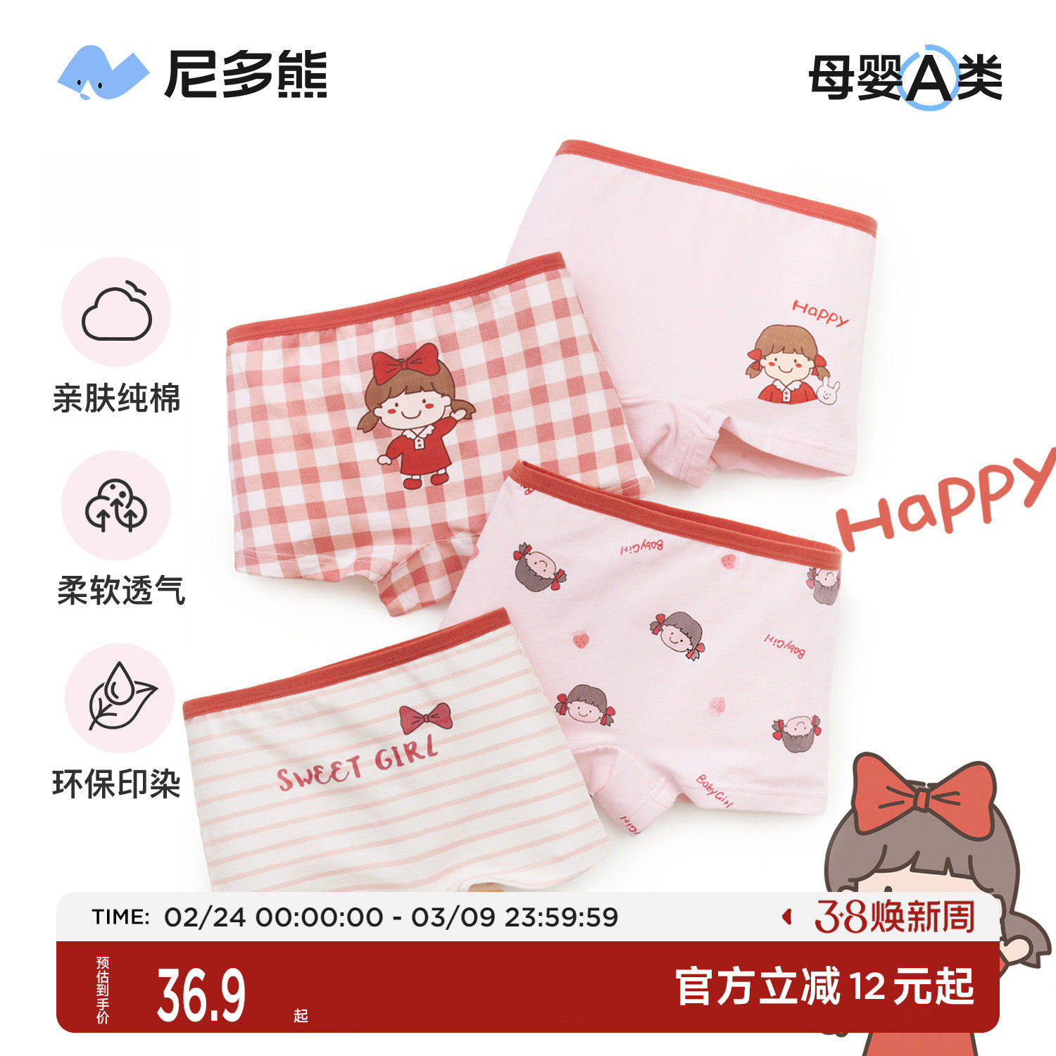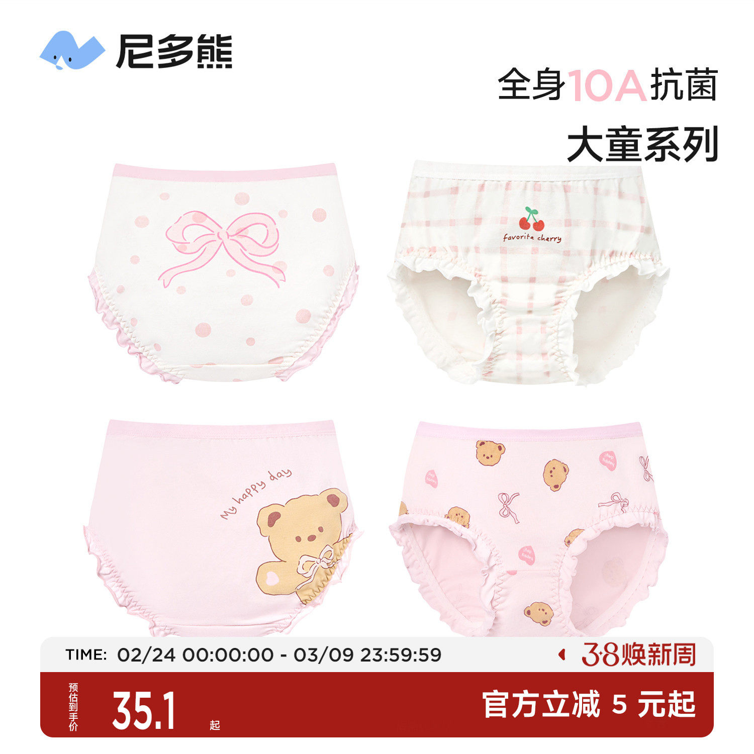 尼多熊女童纯棉内裤儿童三角短裤中大童女孩抗菌裤头发育期不夹PP