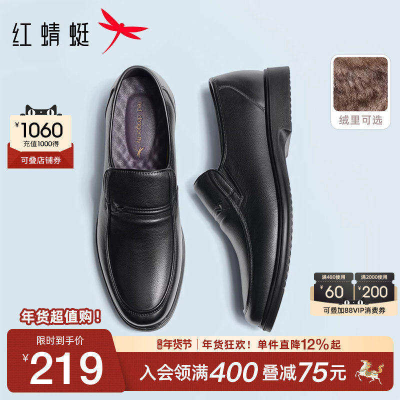 红蜻蜓男鞋真皮中老年休闲商务皮鞋正品高档加绒一脚蹬懒人爸爸鞋