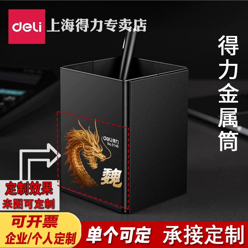 得力金属商务笔筒桌面办公大容量多功能收纳笔插方形创意简约时尚展会摆件磨砂质感学生笔筒可定制企业logo