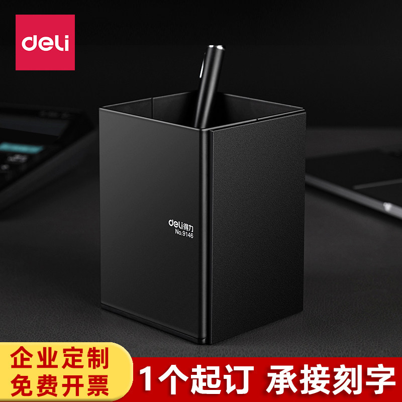 得力笔筒CEO经典黑色金属大笔筒收纳学生商务办公方形创意高档时尚简约笔桶底部防滑稳固牢靠9146
