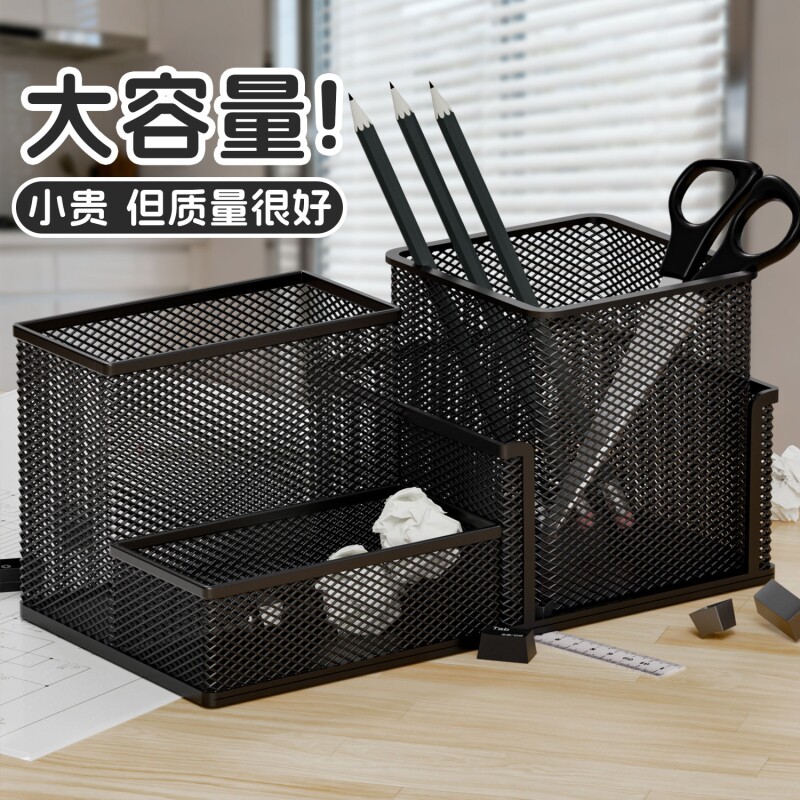 笔筒办公桌面收纳盒大容量多功能笔盒学生书桌杂物收纳架简约网格金属笔插文具商务笔类整理架办公用品储物架