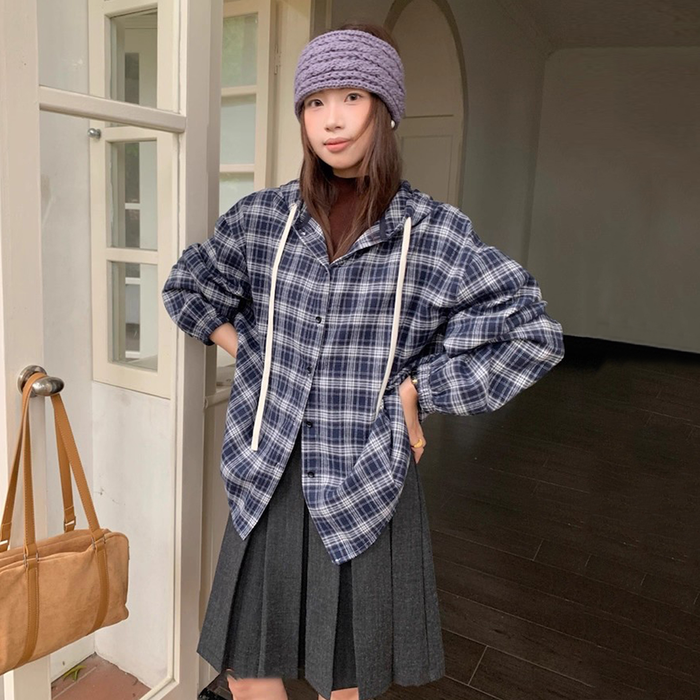 预/韩国东大门2025秋季新品格子连帽抽绳衬衫外套女宽松显瘦长袖