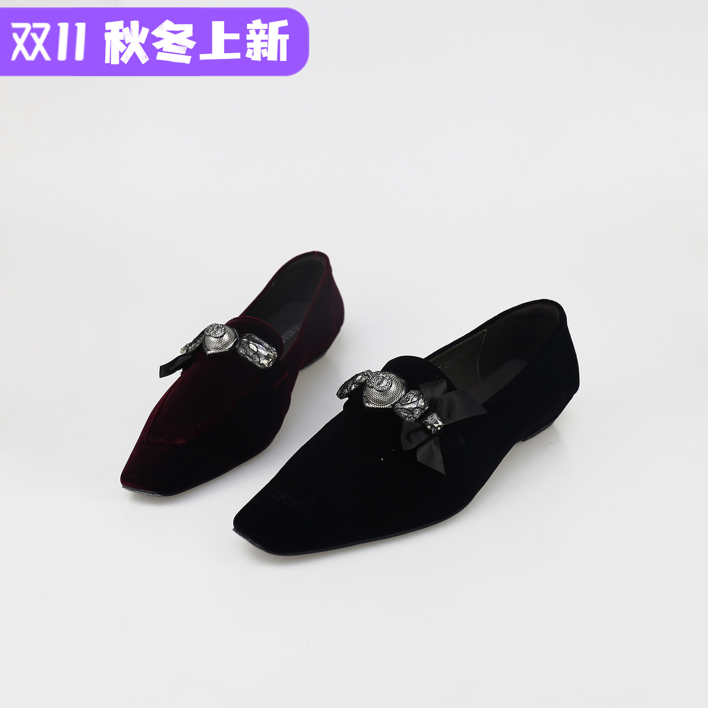 可媚2025新秋款方头天鹅绒金属饰扣蝴蝶结一脚蹬单鞋女KC25822-07