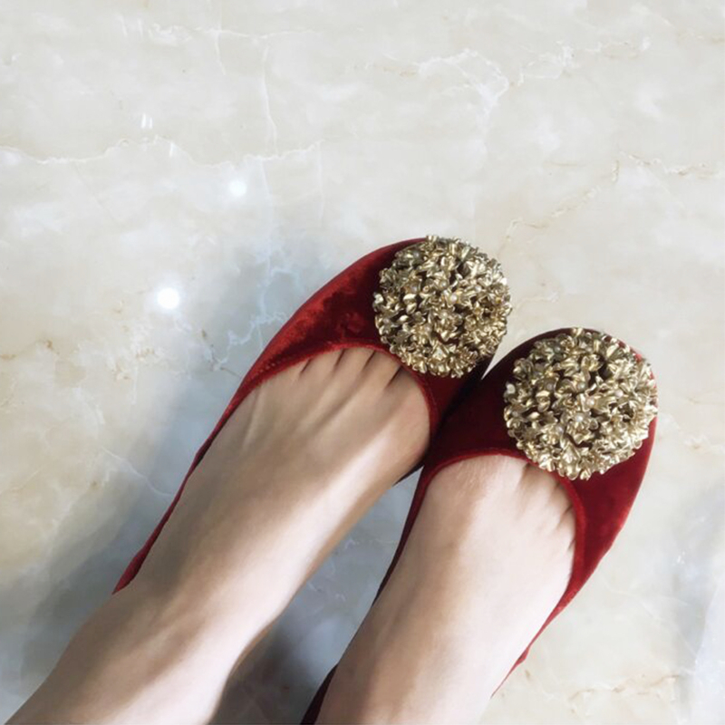 2024春季时尚女鞋天鹅绒金花扣圆头伴娘鞋新娘红色婚鞋平底单鞋女