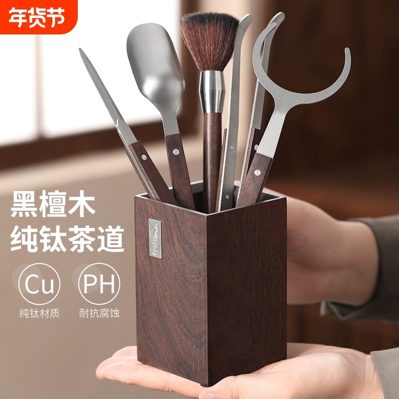 纯钛茶勺茶铲防滑钛茶夹套装茶具配件大全茶台茶盘黑檀茶道六君子
