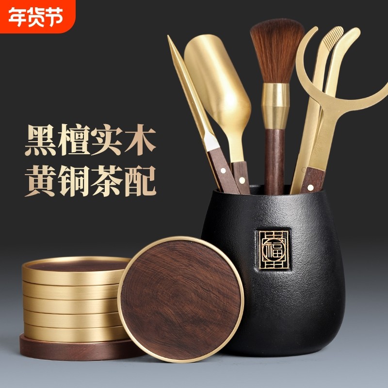 茶具配件六君子套装黄铜茶杯垫黑檀木茶道6君子实木茶筒茶刀高档