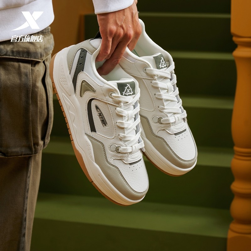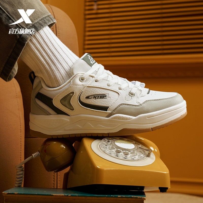 特步男鞋男士板鞋2025新款皮面防水复古休闲鞋子学生白色运动鞋男