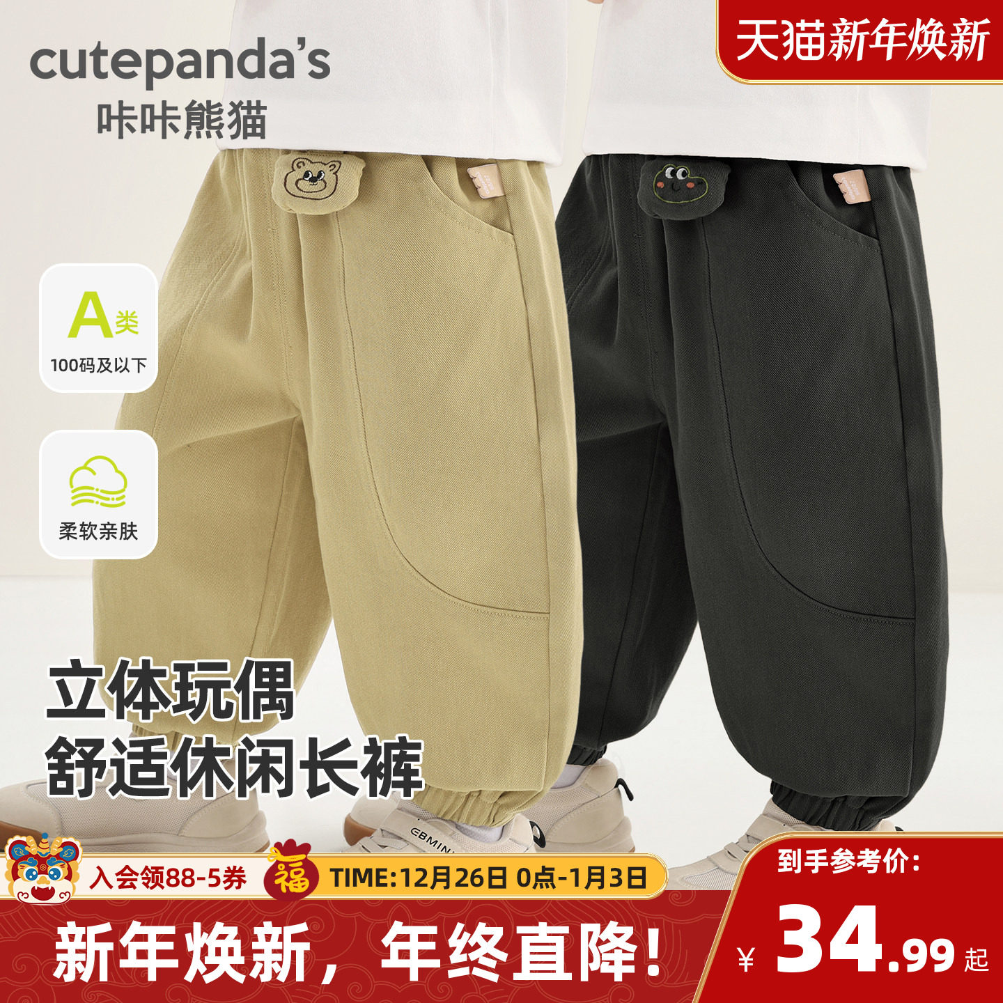 咔咔熊猫男童全棉裤子春秋款婴儿宝宝百搭长裤儿童春装休闲裤春季