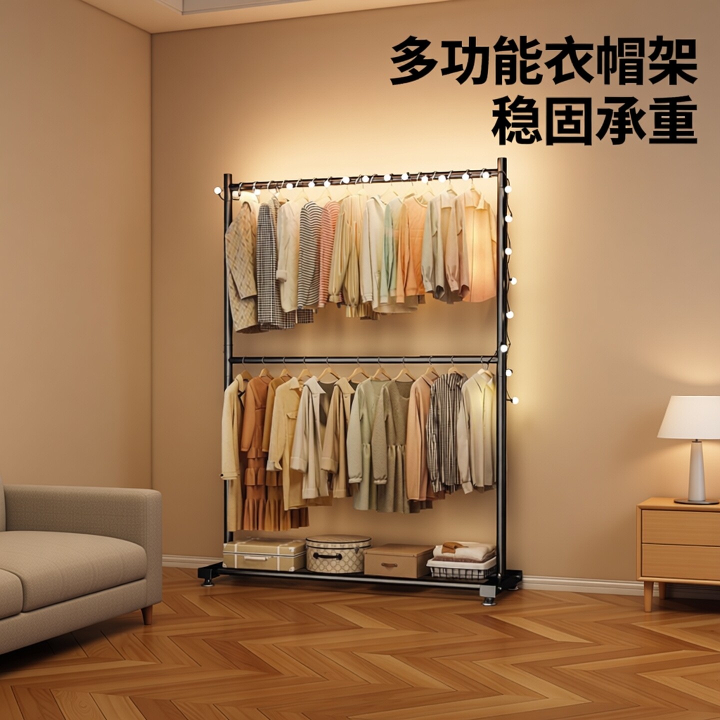 卧室双层落地衣帽架家用床边可移动挂衣架简易放衣服的神器晾衣架