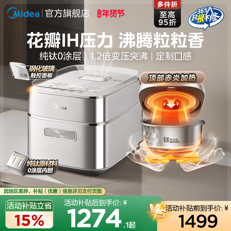 美的花瓣IH压力电饭煲家用多功能煮小米纯钛0涂层电压力锅电饭锅