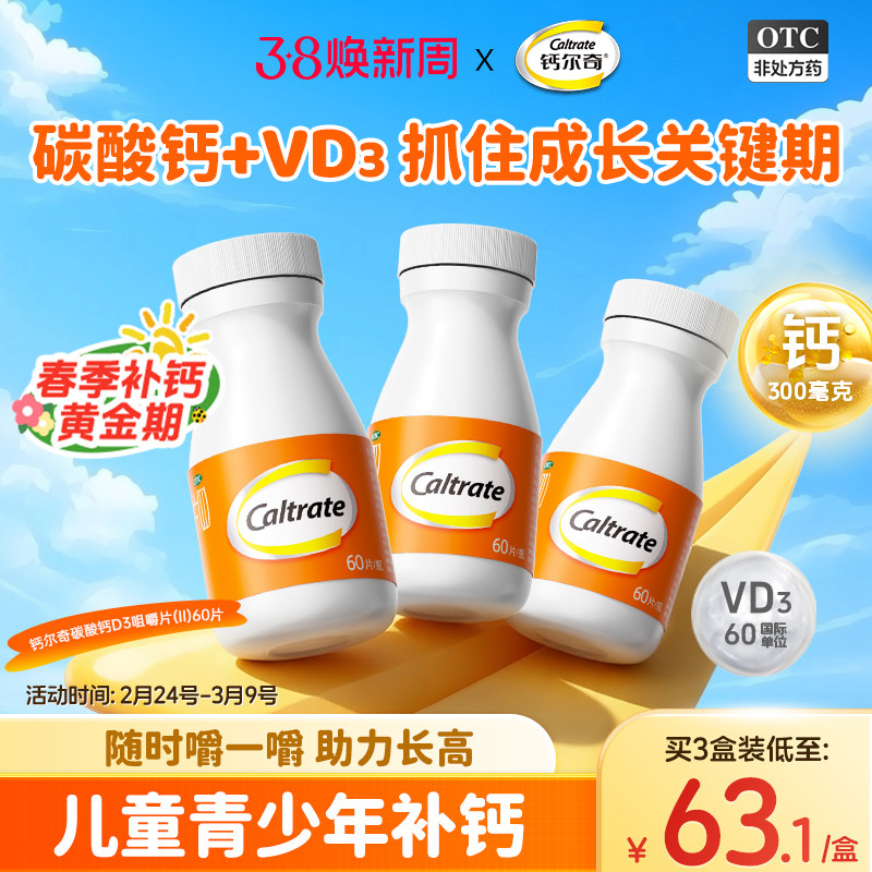 钙尔奇碳酸钙D3咀嚼片4到17岁60片儿童补钙维生素钙片长高青少年
